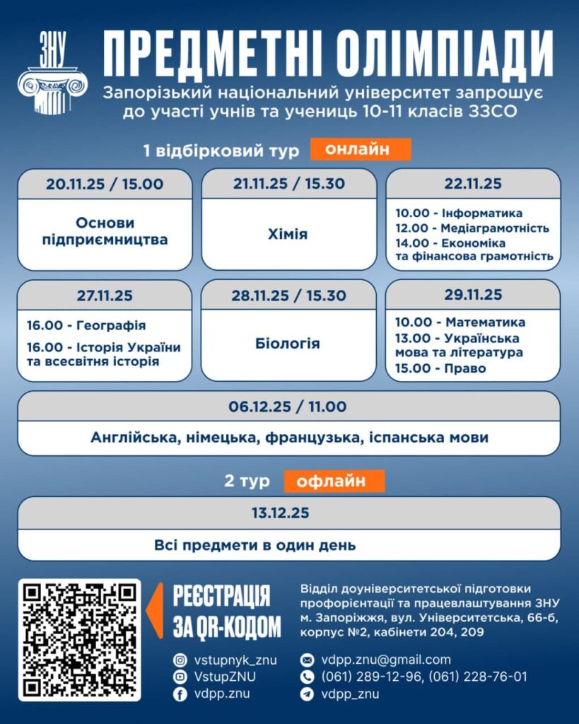 Стань учасником предметних олімпіад ЗНУ — перевір свої знання та зроби крок до успіху! Запрошуємо учнів 11-10 класів взяти участь у предметних олімпіадах Запорізького національного університету Це чудова можливість перевірити свої знання та підсилити мотиваційний лист.
