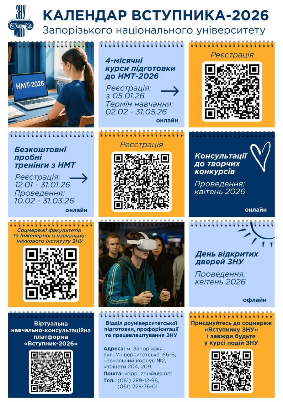 Стартуй до вступу разом із ЗНУ: Календар вступника-2026 Календар вступника-2026 від Запорізького національного університету об’єднав найважливіші події для абітурієнтів: консультації, курси, тренінги та День відкритих дверей. Відмічай дати й упевнено крокуй до омріяної спеціальності.